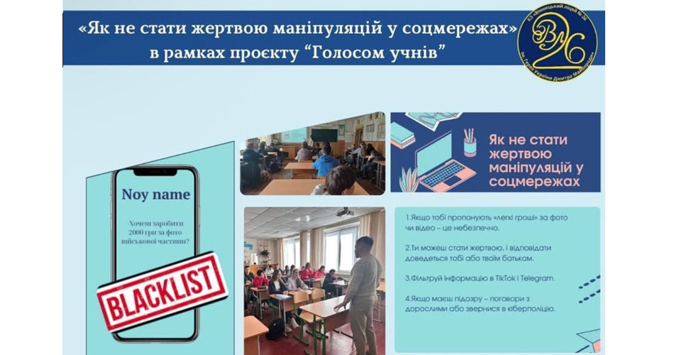 З метою запобігання втягненню дітей у протиправну діяльність та захисту від маніпуляцій у цифровому середовищі, омбудсмени ліцею разом із соціальним педагогом Висоцьким Д.В. провели тематичні бесіди з учнями 7-9 класів на тему «Як не стати жертвою маніпуляцій у соцмережах».Зустрічі відбулися в рамках проєкту «Голосом учнів» …